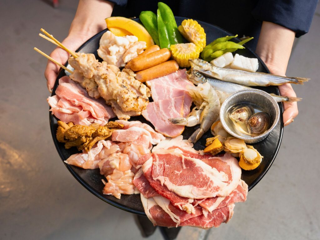 フードメニューは、自分で焼いて楽しむBBQスタイルが中心。スパイスや調味料も複数用意し、好みに合わせて味変できるのが魅力。食べ飲み放題の基本となるスタンダードコースは、ディナーが大人5,800円、小学生1,500円、ランチが大人5,000円、小学生1,500円。未就学児は無料となる。