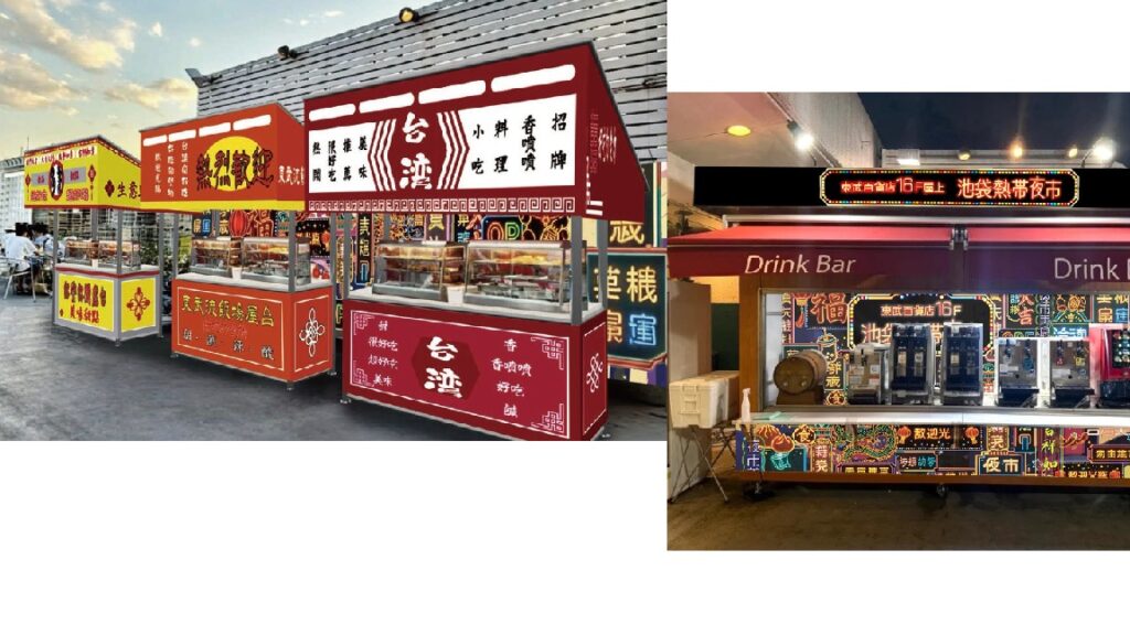 会場には中華提灯やネオンを配し、アジアのグルメマーケットをイメージした空間を演出。ドリンクバーもネオンサイン風の装飾を施し、屋上ならではの開放感と夜市らしいにぎわいを両立させている。
